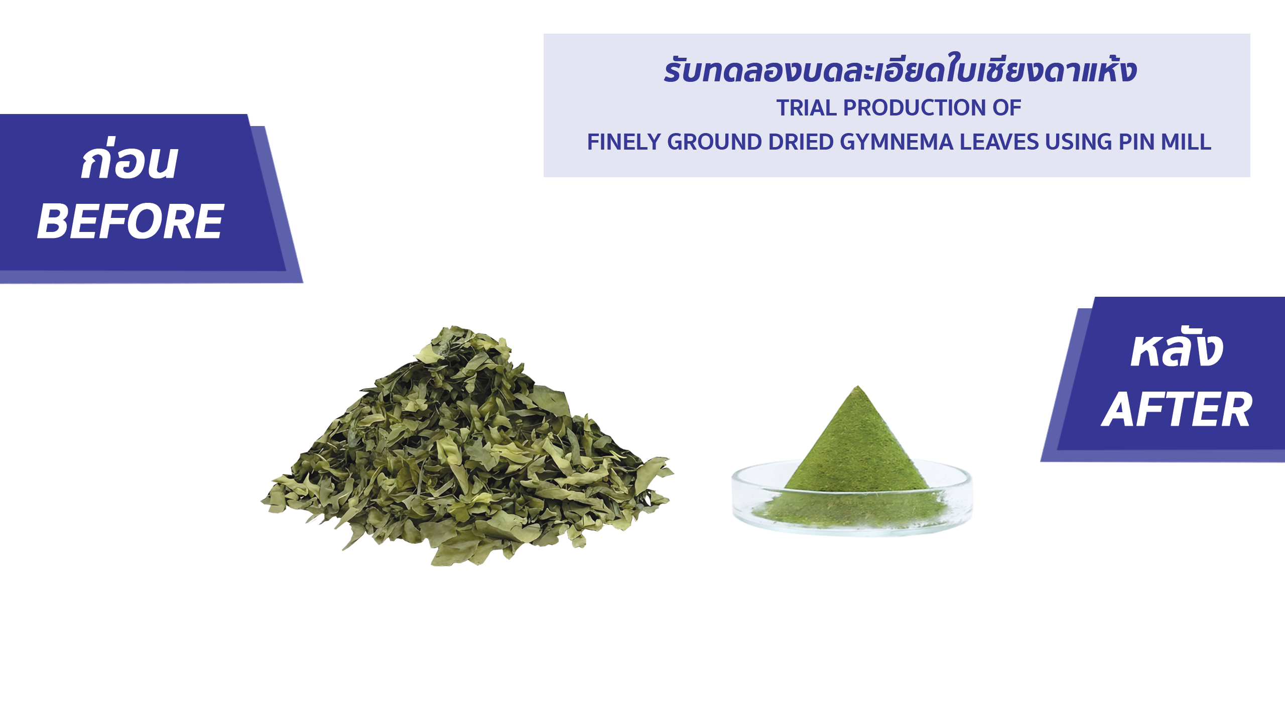 รับทดลองบดละเอียดใบเชียงดาแห้ง (TRIAL PRODUCTION OF FINELY GROUND DRIED GYMNEMA LEAVES USING PIN MILL)