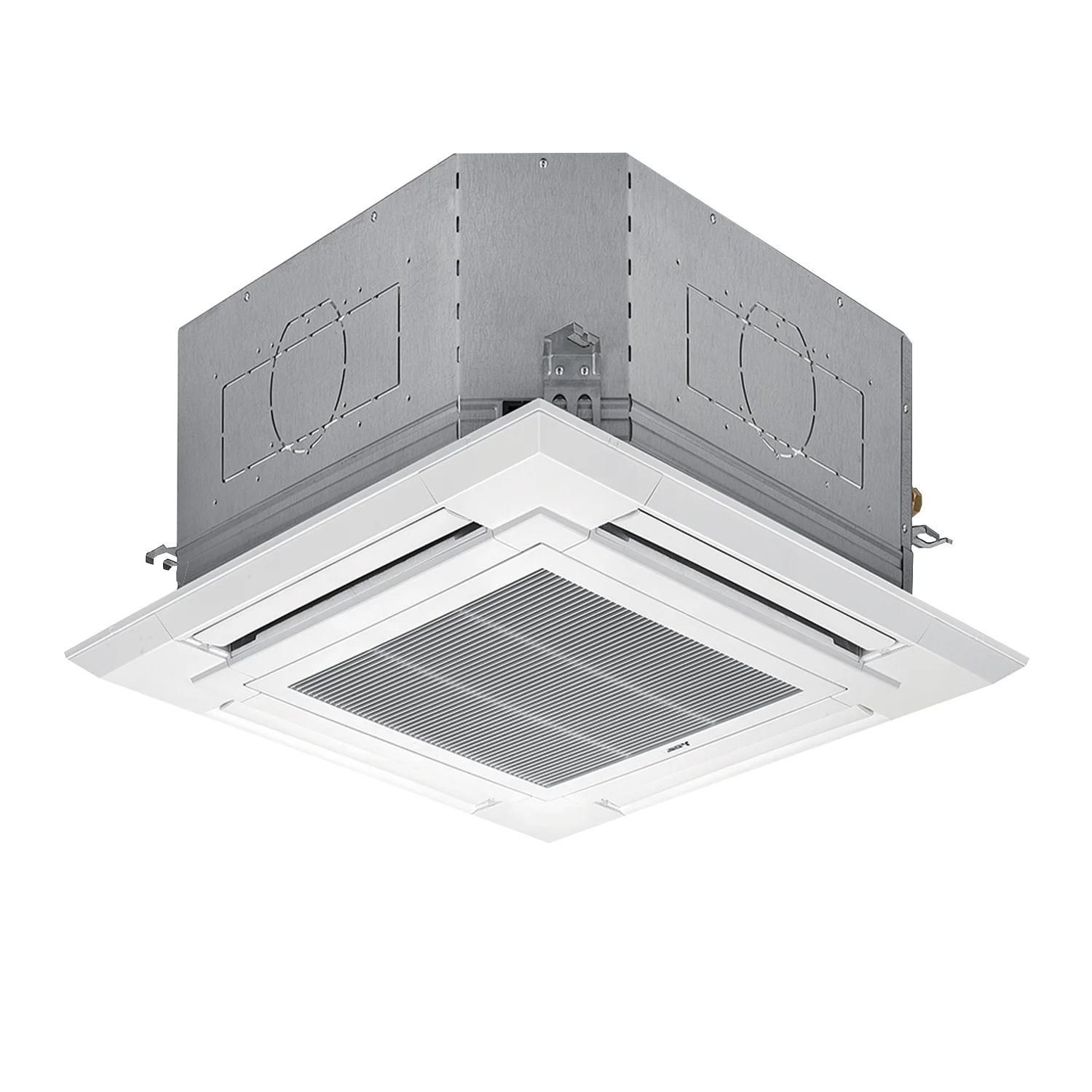 4 WAY CASSETTE AIR CONDITIONER คือแอร์ที่ติดตั้งแบบฝังในฝ้าเพดาน มีช่องลม 4 ทิศทาง ช่วยให้กระจายลมเย็นได้ทั่วถึงทั้งห้อง นิยมใช้ในอาคารขนาดกลางถึงใหญ่ เพราะให้ทั้งความเย็นและความสวยงามโดยไม่เปลืองพื้นที่ผนัง